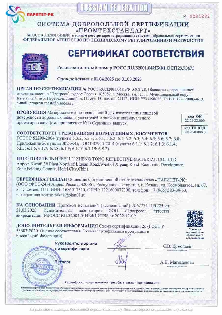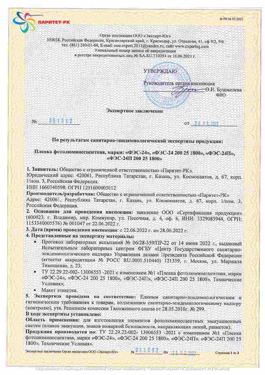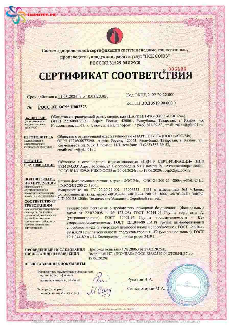 ООО «Паритет-РК» с 2012 года занимает заметное место среди производителей фотолюминесцентных плёнок в России. Мы выпускаем материалы, которые соответствуют стандартам ГОСТ 12.4.026-2015 (с изменением №1 от 01.10.2019 г.) и ГОСТ 34428-2018, что подтверждается необходимыми сертификатами.