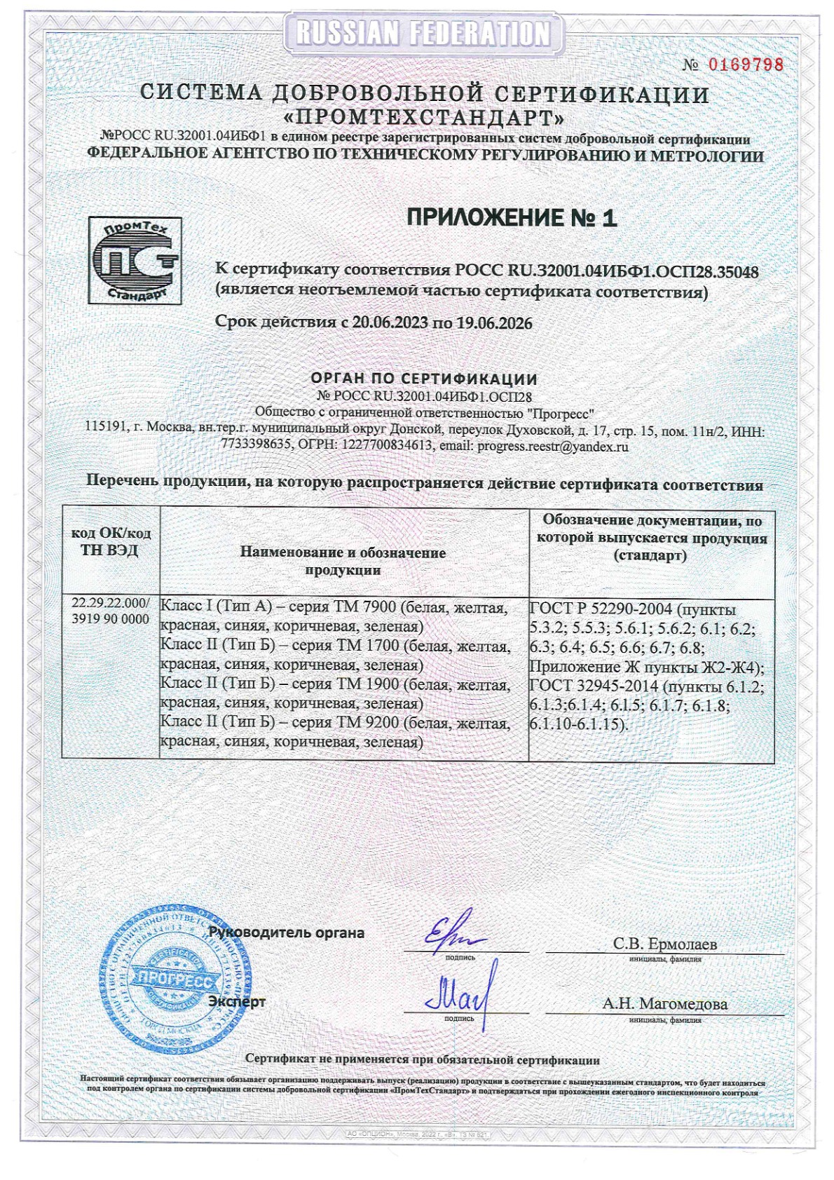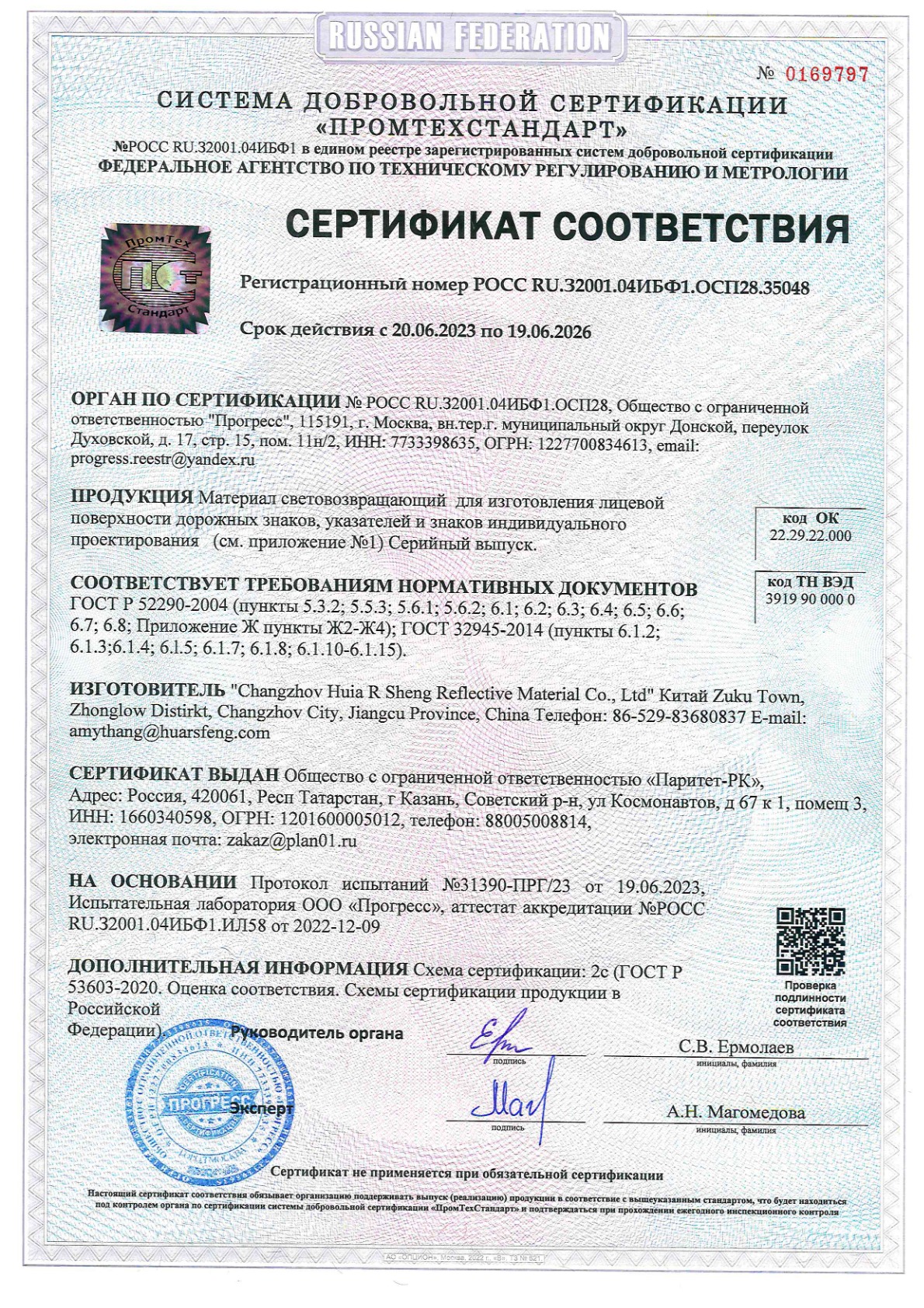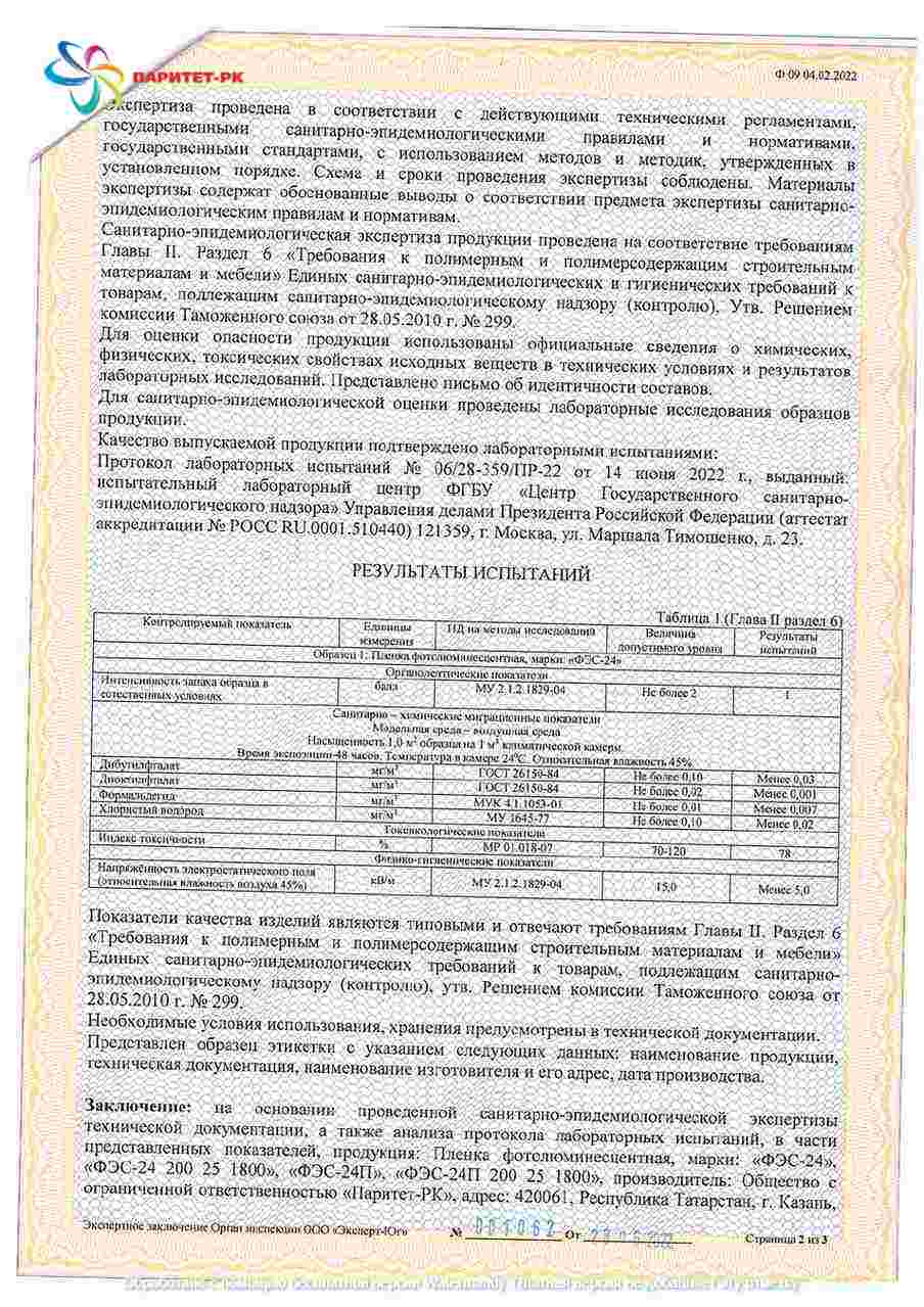 ООО «Паритет-РК» с 2012 года занимает заметное место среди производителей фотолюминесцентных плёнок в России. Мы выпускаем материалы, которые соответствуют стандартам ГОСТ 12.4.026-2015 (с изменением №1 от 01.10.2019 г.) и ГОСТ 34428-2018, что подтверждается необходимыми сертификатами.